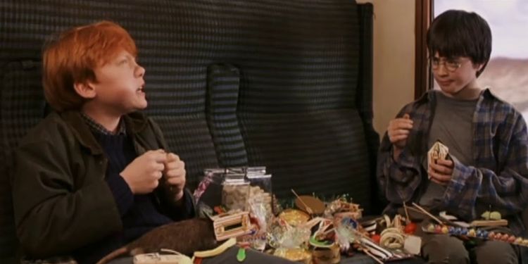 Khoảnh khắc càng trở nên quý giá hơn khi chiếc xe đẩy kẹo đi ngang qua, và Harry quyết định giúp Ron thoát khỏi bữa trưa chẳng có chút gì ngon lành của mình bằng cách mua cả chiếc xe đẩy. Tiếp tục sau đó cảnh các cậu bé ngồi chung một chỗ trong toa tàu, xung quanh là một đống kẹo. Niềm vui và tiếng cười thoải mái của họ cho thấy cả hai bắt đầu trở thành bạn, trở thành một phần không thể thiếu của nhau trong suốt hành trình dài phía trước.