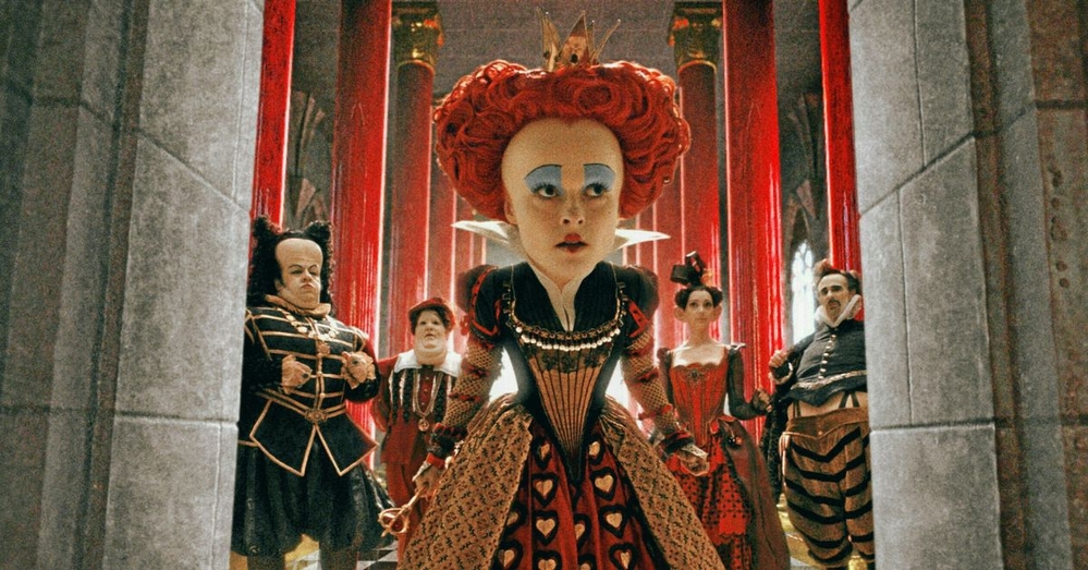 Cái đầu bự chảng đặc trưng của Nữ Hoàng Đỏ hóa ra có cả một câu chuyện đau buồn đằng sau. Trong một lần Nữ Hoàng Trắng ăn vụn bánh mà chối rồi Nữ Hoàng Đỏ bị mắng oan. Tức quá nên Nữ Hoàng Đỏ mới chạy ra khỏi cung điện nhưng mà vừa chạy vừa khóc nên là mờ mắt, đung cái đầu vô tháp đồng hồ nên khiến nó bị sưng to bự chảng đến bây giờ luôn. Và cũng vì nỗi bực tức đó nên bà ta mới trở nên xấu tính như vậy.