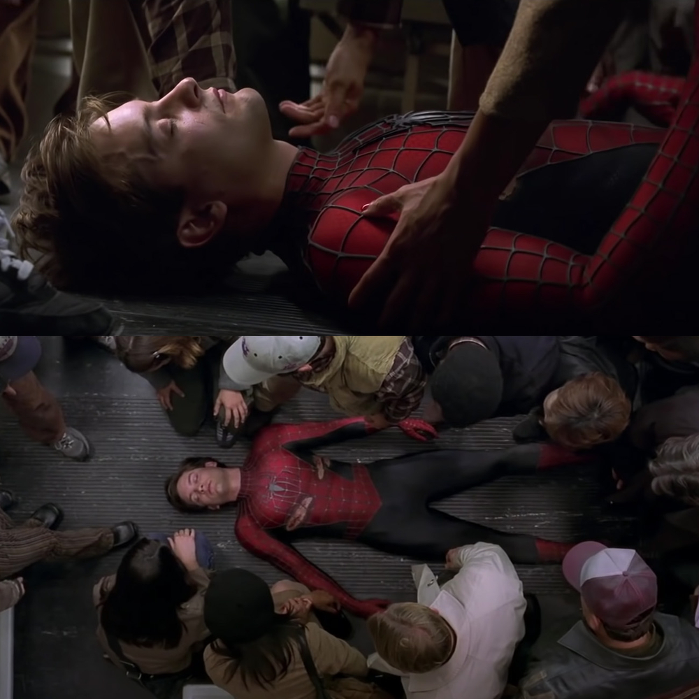 Spider-Man 2 là một trong những bộ phim siêu anh hùng mà mình yêu thích nhất. Ở cuối phim, Spider-Man của Tobey Maguire đã dồn hết sức để chặn đoàn tàu và kết quả là anh ngất xỉu vì kiệt sức. Lúc này những người trên tàu đã đỡ lấy anh và đưa vào nơi an toàn.