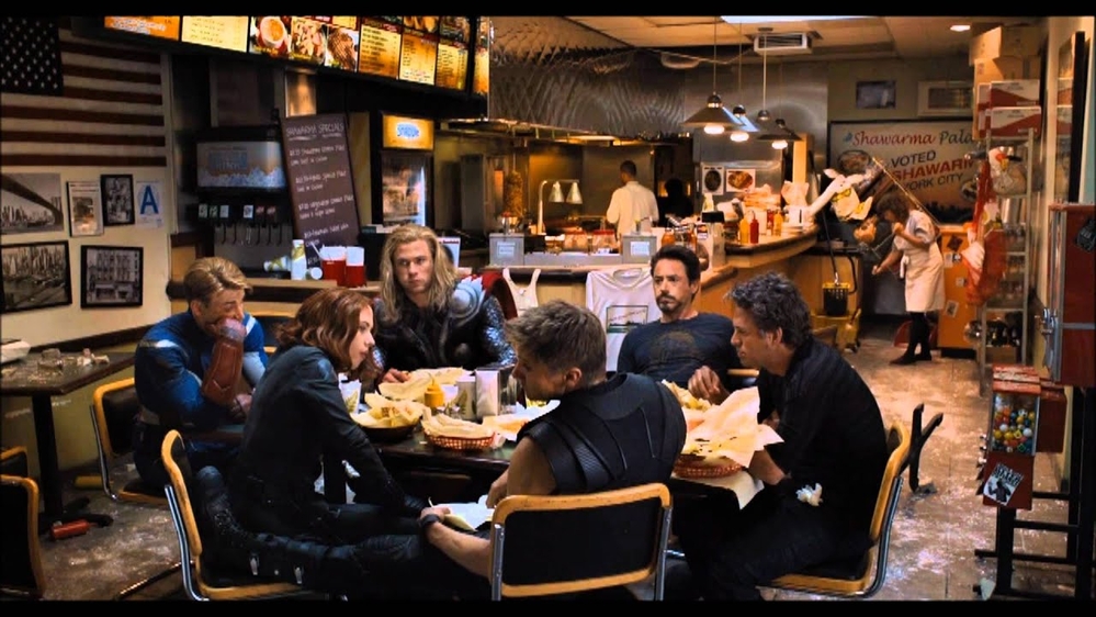 Kết phim siêu anh hùng mà mình thấy thú vị và hài hước nhất chính là kết thúc của Avengers. Theo đó, sau khi 6 thành viên của Avengers giành chiến thắng trước Loki và binh đoàn Chitauri, họ đã cùng nhau ghé một quán ăn đổ nát và ăn lót dạ. Đó cũng là khoảnh khắc mở màn cho xu hướng thêm vài thước phim vui nhộn trước và sau cảnh hậu danh đề (after-credit).