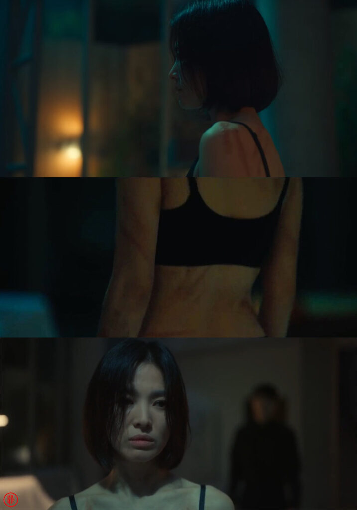 Từ trước tới nay, Moon Dong Eun vẫn thường mặc những chiếc áo dài tay nhằm che kín những vết sẹo, cũng như che giấu quá khứ đau buồn của mình. Chính vì thế, mình nghĩ rằng Moon Dong Eun đang muốn bộc lộ một phần con người ẩn sâu của mình khi cho Yeo Jeong nhìn thấy những vết sẹo đó.