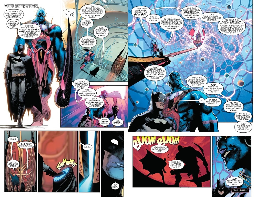 Xuất hiện lần đầu trong tập truyện Justice League (2018) #24, hình dạng ban đầu của Final Bat-Suit vốn là một chiếc ghế được thực thể kiến tạo vũ trụ World Forger gọi là Son Box. Chiếc ghế này được một Batman ở thực tại khác tạo ra nhằm có thể nhìn thấu tâm can mọi sinh vật, để biết họ đi theo con đường nào và thậm chí là có thể nhào nặn họ thành những kẻ mà anh muốn.