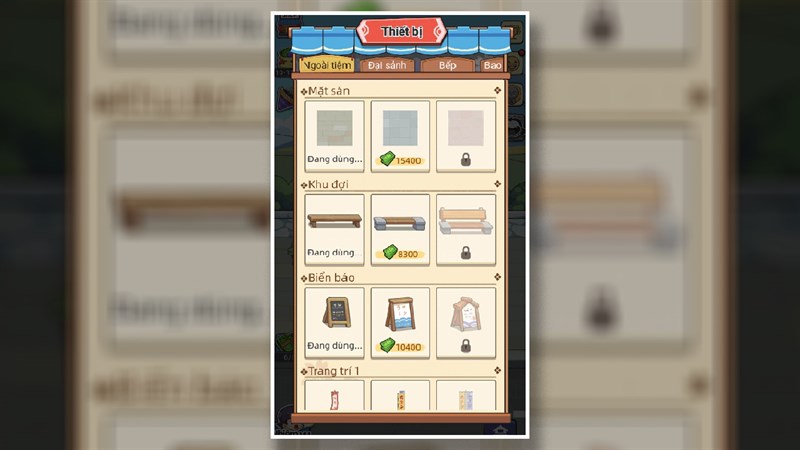 Để có thể nâng cao điểm đánh giá thiết bị cho nhà hàng của mình thì bạn có thể mua thêm các thiết bị, vật dụng mà tiệm của mình chưa có hoặc nâng cấp chúng lên. Nhưng để làm sao có chi phí thấp nhất mà vẫn có nhiều điểm thì khi mua mới hay nâng cấp thì bạn hãy chú ý đến giá tiền của thiết bị đó và điểm đánh giá mà thiết bị đó cho ra. Tại giao diện chính của game, chọn vào mục Xây thì bạn sẽ có thể xem các thiết bị trong game mà bạn có thể mua.