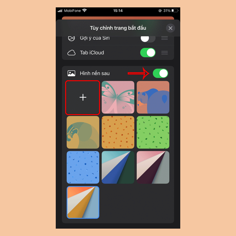 Bước 4: Bên cạnh đó, bạn hãy gạt nút bật ở mục Hình nền sau để lựa chọn ảnh nền cho trang bắt đầu của Safari. Đó có thể là hình ảnh mà Safari gợi ý sẵn hay thậm chí là hình từ Kho ảnh của bạn đều được. Chỉ việc bấm vào dấu + và chọn từ Album của bạn.