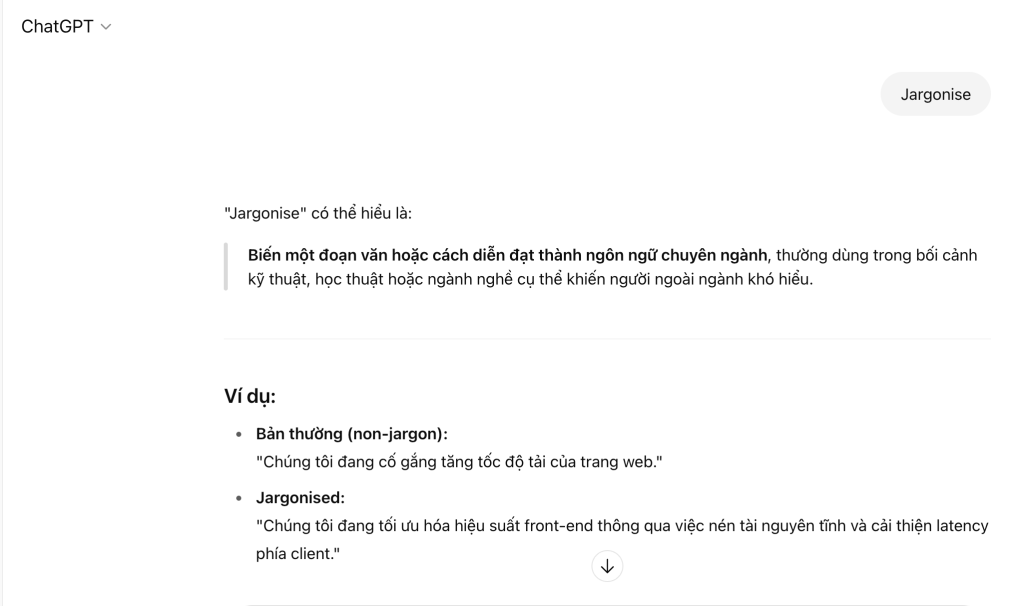Trái ngược với ELI5, khi bạn cần văn bản mang tính học thuật hoặc chuyên nghiệp hơn, hãy sử dụng “Jargonise” đầu prompt. ChatGPT sẽ chuyển đổi giọng văn theo hướng học thuật, thêm vào các thuật ngữ chuyên ngành phù hợp với nội dung. Rất phù hợp khi bạn viết báo cáo, luận văn, tài liệu nội bộ hoặc chuẩn bị bài thuyết trình cho đối tượng có chuyên môn cao.
