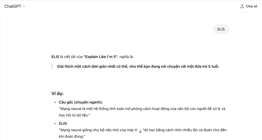 “ELI5” là viết tắt của “Explain Like I’m 5” – giải thích như thể tôi mới 5 tuổi. Khi gặp một khái niệm phức tạp, bạn chỉ cần thêm “ELI5:” vào trước câu hỏi, ChatGPT sẽ trả lời bằng cách đơn giản hóa nội dung, dùng từ ngữ dễ hiểu và ví dụ thực tế. Đây là mẹo tuyệt vời dành cho những người mới học một chủ đề mới hoặc cần hiểu nhanh trước khi nghiên cứu sâu hơn.