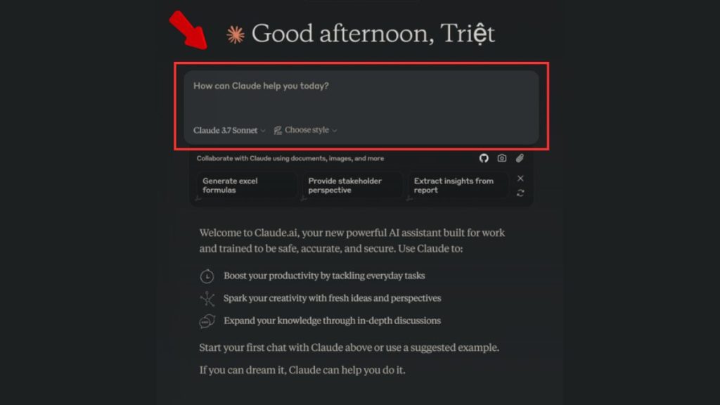 Bước 3: Cuối cùng, bạn chỉ cần nhập liệu đầu vào (prompt) mà bạn muốn gửi cho Claude vào khung trò chuyện và bắt đầu tương tác.