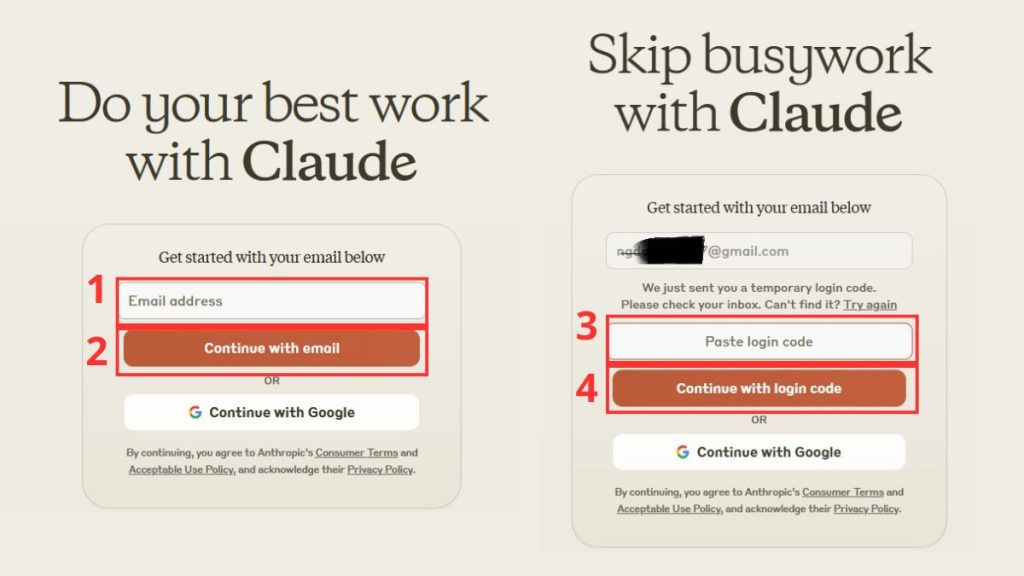 Bước 1: Truy cập trang web chính thức của Claude 3.7. Nhập địa chỉ email của bạn vào ô tương ứng và chọn “Continue with email”. Sau đó, hãy kiểm tra hộp thư đến, sao chép mã xác nhận được gửi và dán vào ô “Paste login code”, rồi nhấn “Continue with login code”.