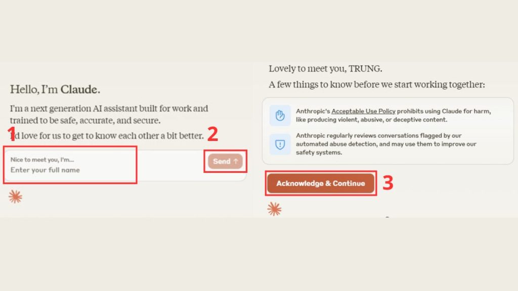 Bước 3: Nhập Họ và Tên của bạn vào các ô tương ứng, sau đó nhấn “Send” và tiếp tục bằng cách chọn “Acknowledge & Continue”.