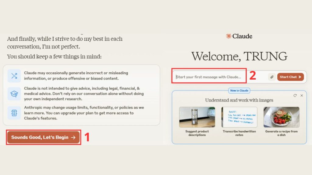 Bước 4: Nhấn “Sounds Good, Let’s Begin”, và bạn đã sẵn sàng để bắt đầu trò chuyện. Nhập yêu cầu đầu tiên của bạn vào ô “Start your first message with Claude…”.