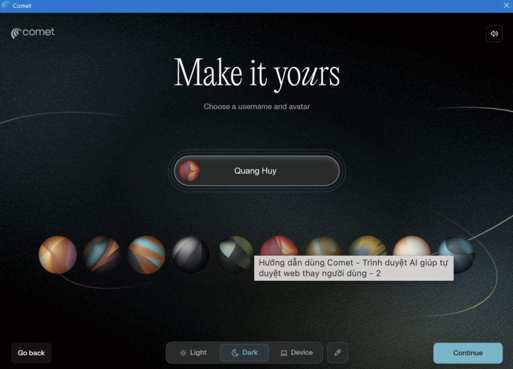 Hiện tại, Comet có phiên bản cho cả Windows và macOS. Người dùng chỉ cần tải file cài đặt từ trang chủ của Perplexity, sau đó mở trình duyệt và nhấn “Get started” để bắt đầu. Ở bước đầu tiên, bạn nhập email rồi chọn “Import” để đồng bộ lịch sử duyệt web và tài khoản từ các trình duyệt khác như Chrome, Edge hoặc Internet Explorer. Nếu không muốn, bạn có thể chọn “Do this later” để bỏ qua. Sau đó, bạn sẽ được yêu cầu tạo hồ sơ người dùng gồm tên, ảnh đại diện và lựa chọn giao diện sáng hoặc tối tùy thích. Khi hoàn tất, hãy nhấn “Continue” để chuyển sang bước kế tiếp.