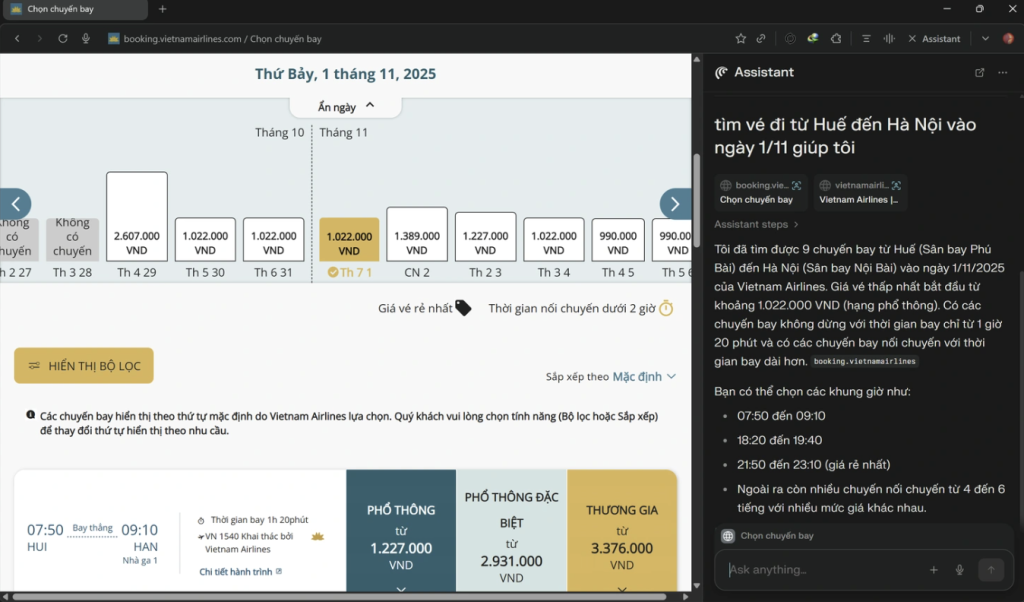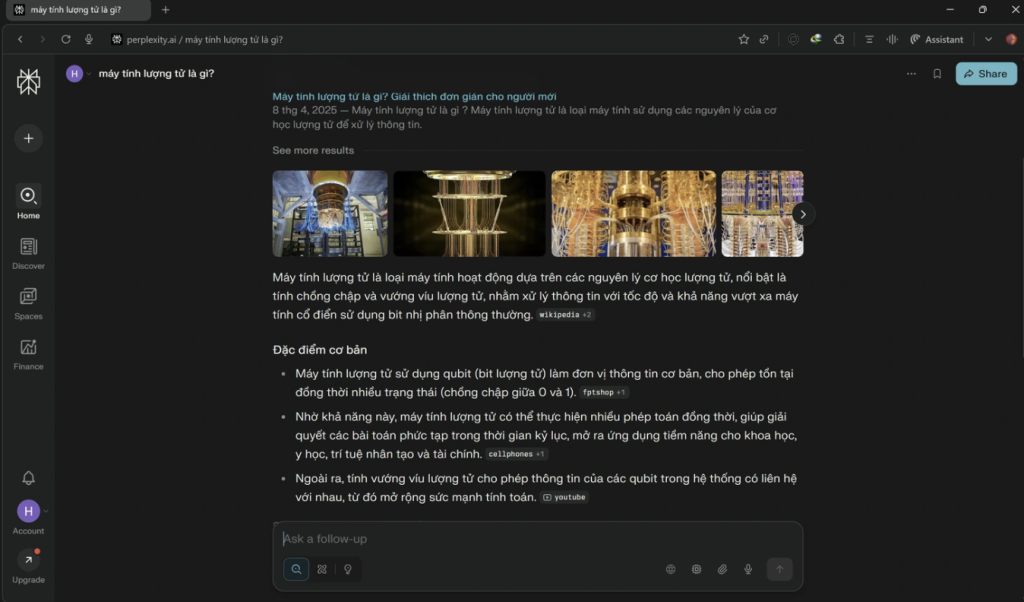 Comet được xây dựng trên nền tảng mã nguồn mở Chromium, tương tự như Chrome, nên có giao diện quen thuộc và tốc độ duyệt web nhanh. Tuy nhiên, điểm khác biệt lớn nhất của Comet nằm ở việc tích hợp trợ lý ảo AI ngay bên trong trình duyệt. Khi nhấn vào biểu tượng “Assistant” ở góc trên bên phải, giao diện trò chuyện sẽ hiện ra để bạn nhập lệnh hoặc ra lệnh bằng giọng nói. Người dùng có thể yêu cầu Comet tóm tắt nội dung trang web đang đọc, mở rộng thông tin hoặc thậm chí tóm tắt video từ YouTube, Facebook và nhiều nền tảng khác.
