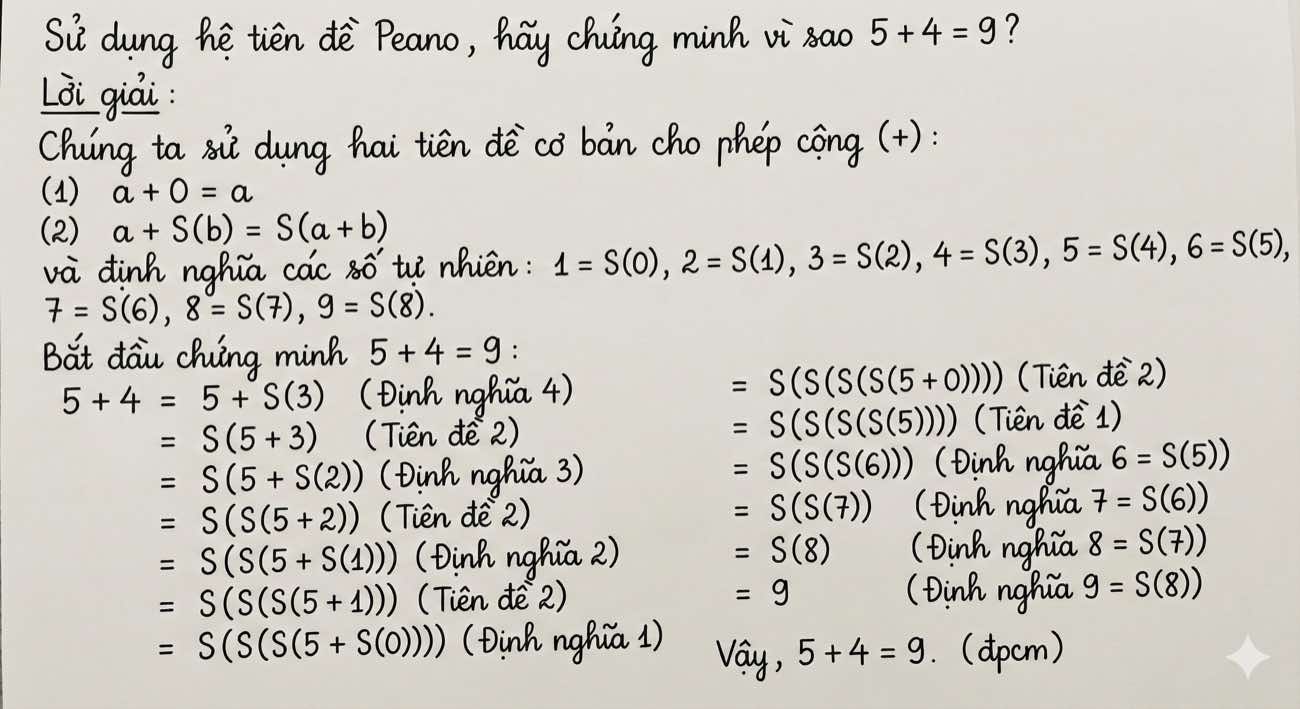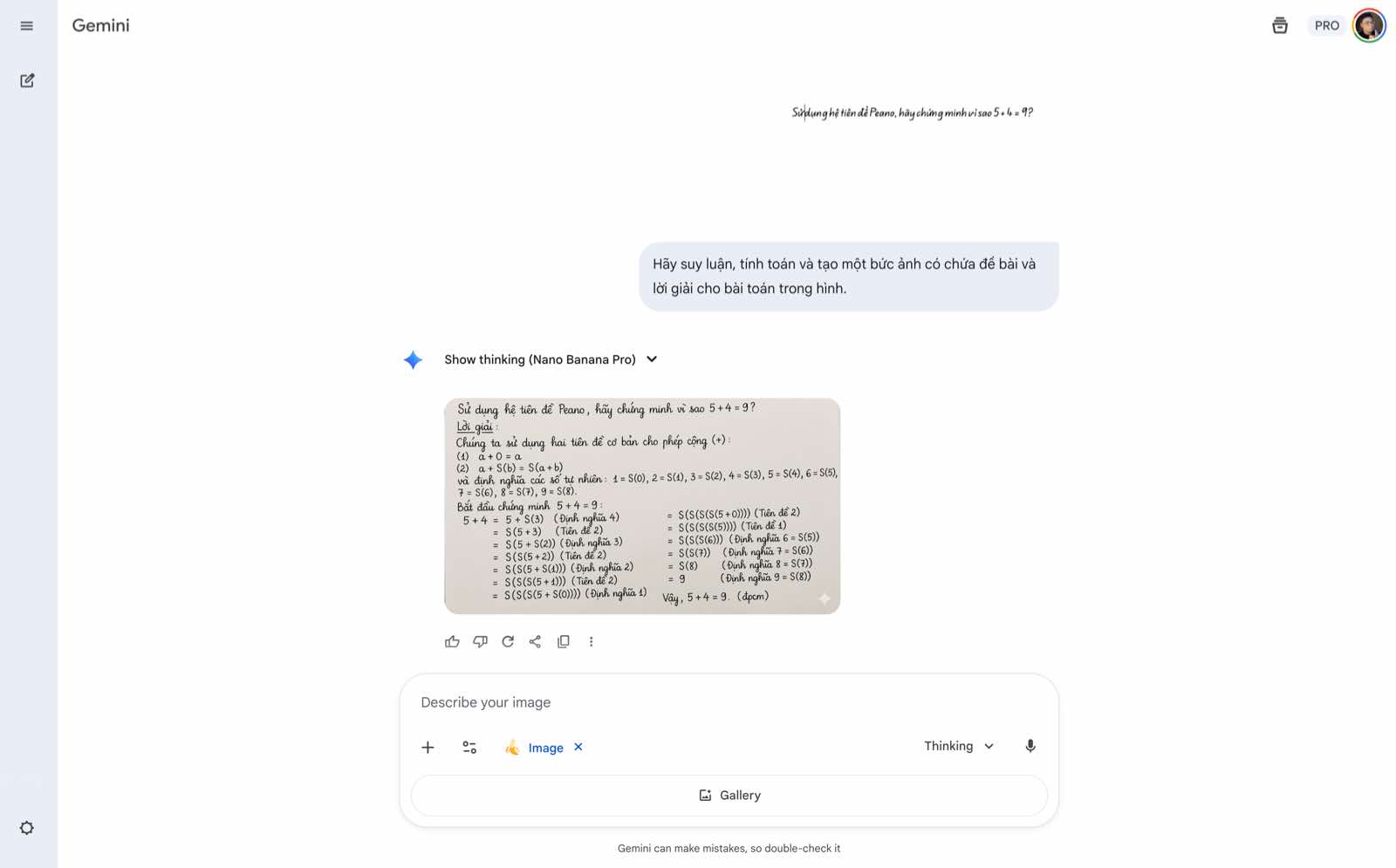 Ở thử thách đầu tiên, mình yêu cầu Gemini dùng Nano Banana Pro để chứng minh một bài toán dựa trên hệ tiên đề Peano dựa trên ảnh chụp đề bài. Thời gian xử lý dao động từ 30 giây đến 1 phút – mức hoàn toàn chấp nhận được cho một tác vụ tạo ảnh phức tạp.