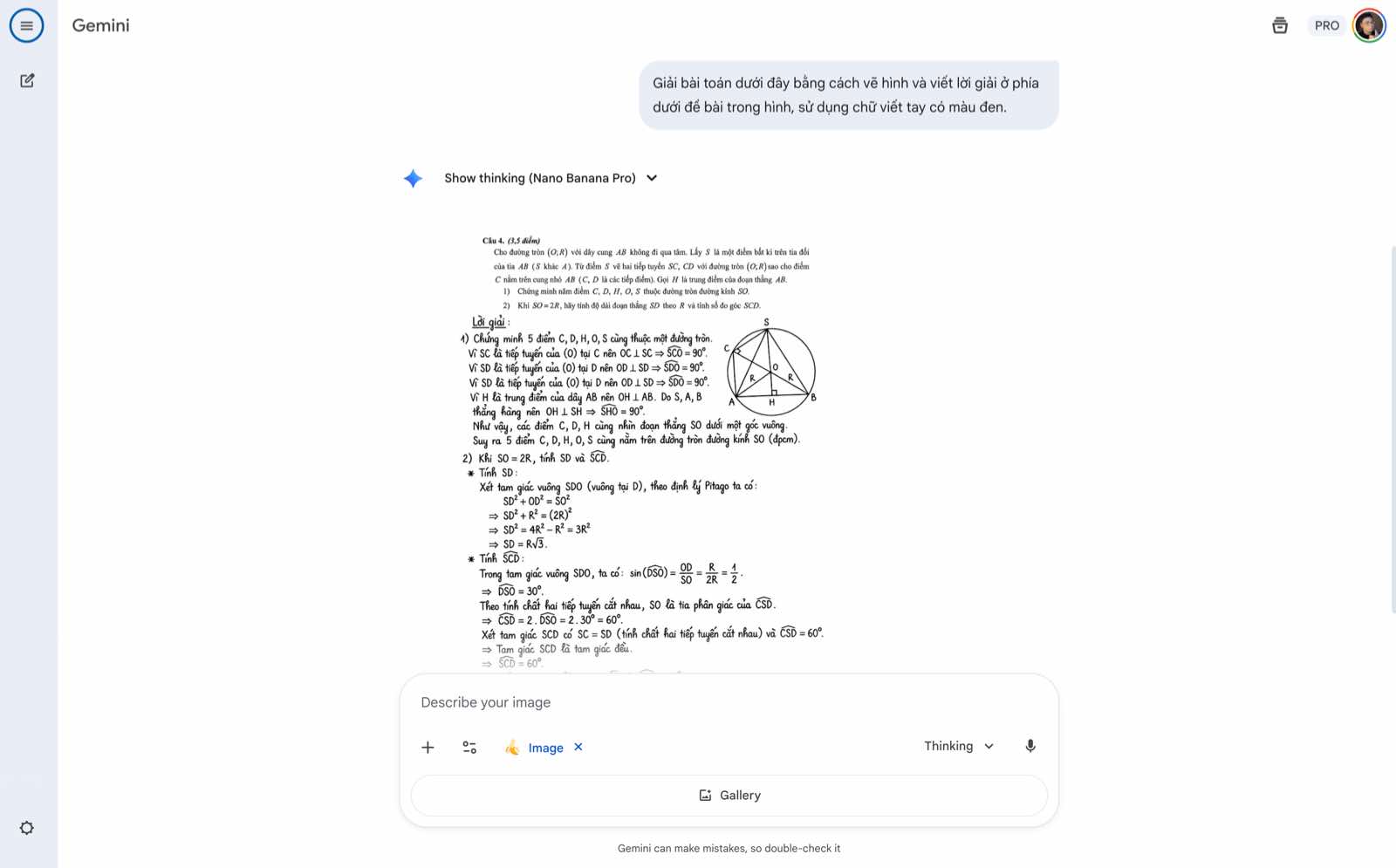 Nano Banana Pro tái tạo văn bản cực kỳ sắc nét. Khi mình yêu cầu mô phỏng chữ viết tay, AI tạo ra nét chữ rất tự nhiên, có bố cục rõ ràng và thậm chí tự động gạch chân mục “Lời giải”. Điều này cho thấy mô hình không chỉ hiểu nội dung mà còn hiểu cả quy tắc trình bày bài toán.