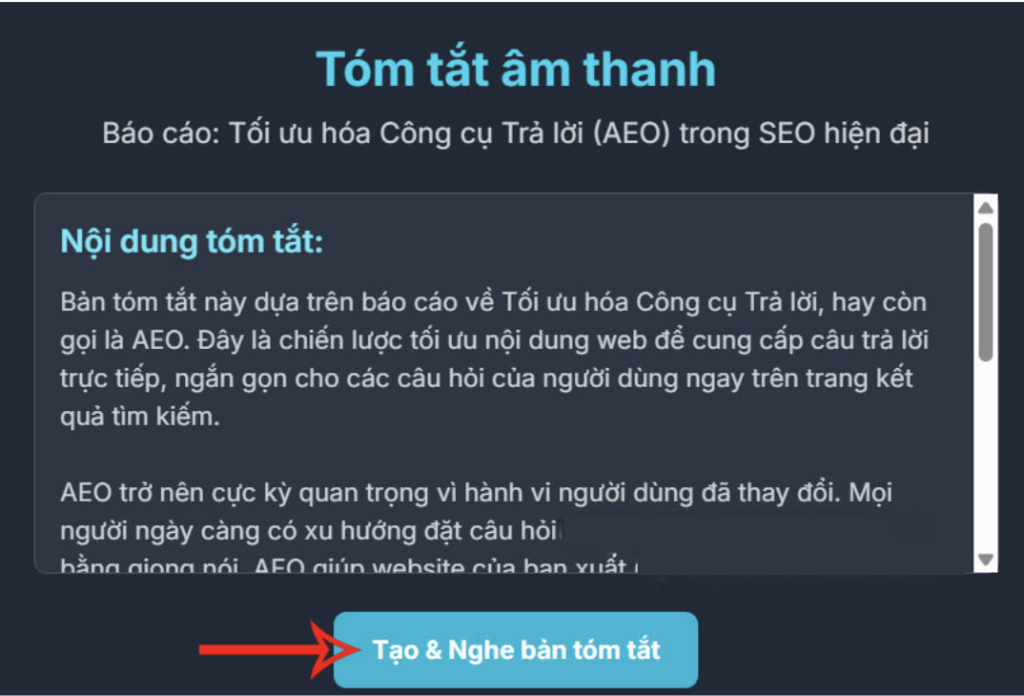 Bước 2: Nhập yêu cầu tạo bản tóm tắt âm thanh. Gemini sẽ phân tích và hiển thị bản tóm tắt dạng văn bản. Nhấn “Tạo & Nghe bản tóm tắt”.