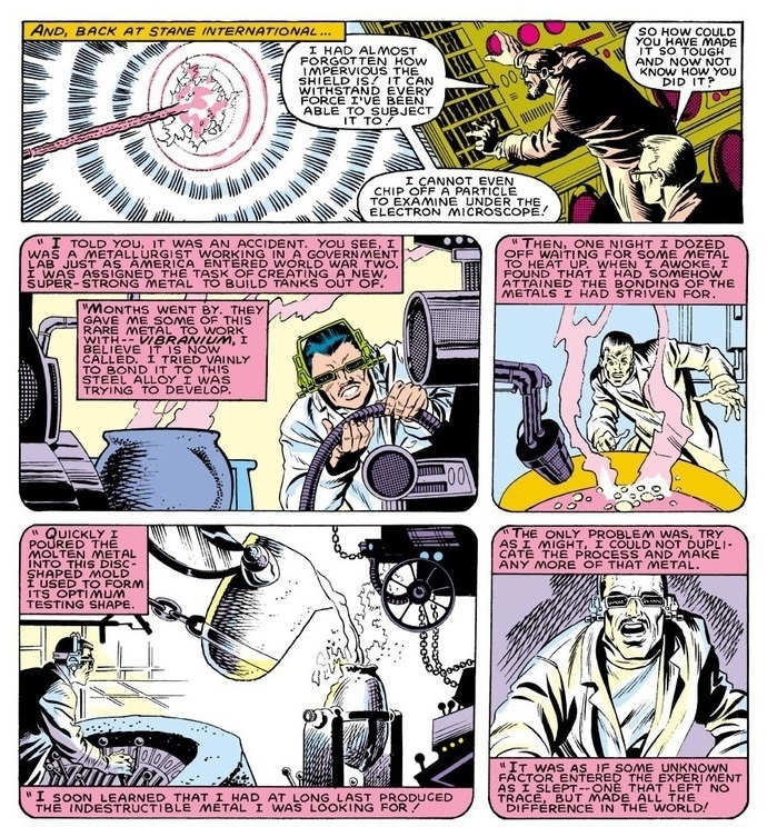 Điều này là đúng, nhưng chưa đầy đủ. Sự thật là điều này chỉ đúng trong trường hợp trong phạm vi MCU, còn truyện (cụ thể là ở vũ trụ chính 616) thì không. Cụ thể, trong tập truyện Captain America (1968) #303, tiến sĩ Myron MacLain đã cố gắng hoàn thiện một hợp kim không thể phá hủy như kim loại Adamantine – kim loại dùng để chế tạo vũ khí cho những vị thần Hy Lạp, nhằm mang lại lợi thế cho Mỹ trong Chiến tranh thế giới thứ 2.