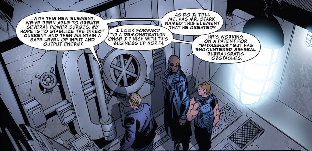 Cụ thể, điều này vốn được nhắc tới trong cuốn sách cùng tên ăn theo của bộ phim này. Tuy nhiên, sau đó thì điều này đã bị bác bỏ trong Captain America: The First Avenger, còn nguyên tố mà Tony tạo ra thì được anh đặt tên là “Badassium”, theo tập truyện The Avengers Prelude: Fury’s Big Week.