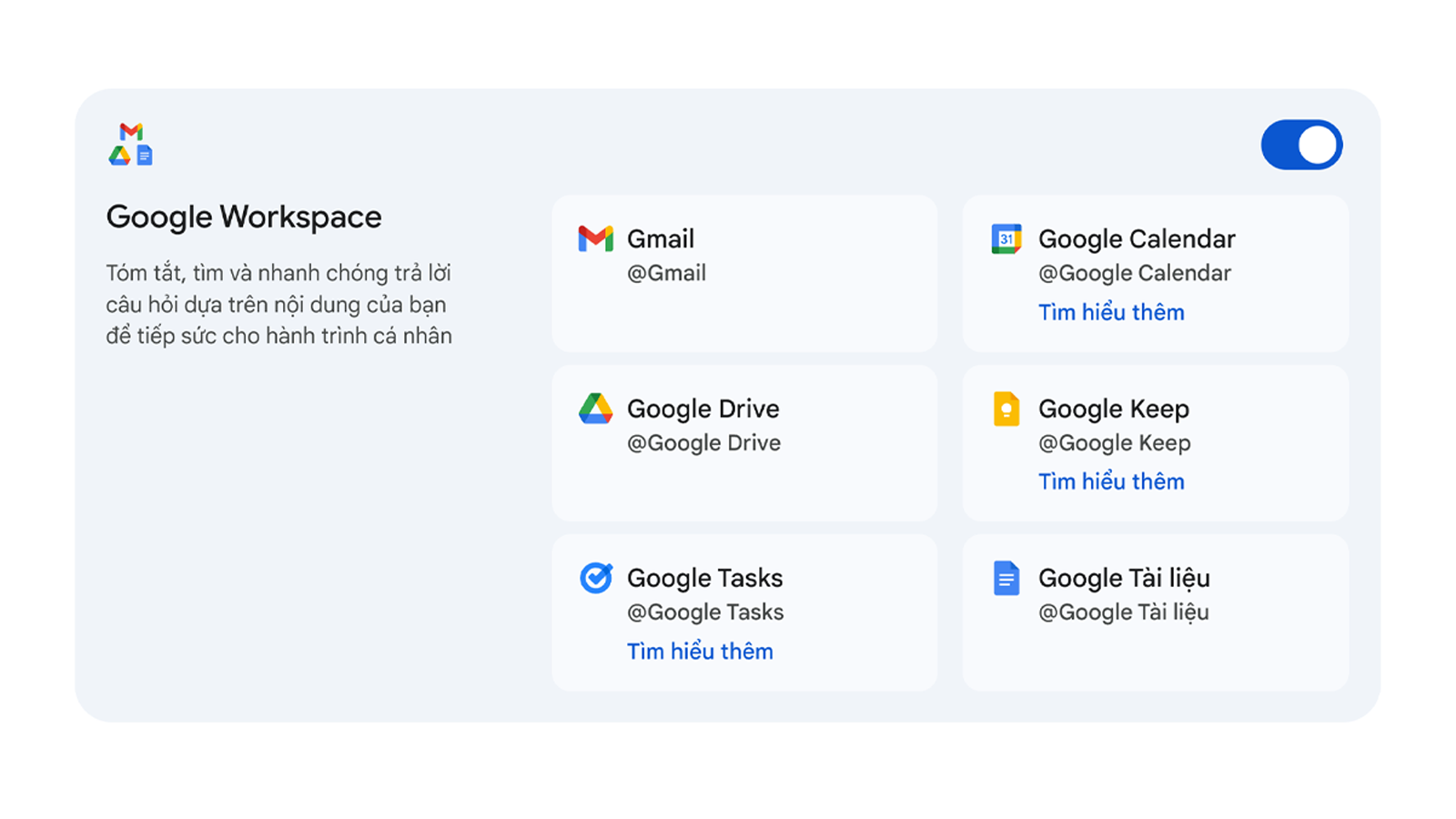 - Google Drive: Tài liệu Docs, Sheets, Slides, PDF và các file lưu trữ liên quan.