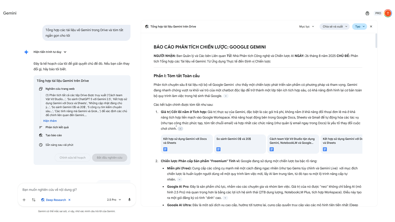 Để sử dụng tính năng này, người dùng mở Gemini trên máy tính và chọn Deep Research trong phần công cụ. Sau đó lựa chọn nguồn dữ liệu muốn phân tích như Drive, Gmail hoặc Search. Ví dụ, nếu nhập câu lệnh: “Tổng hợp các tài liệu về Gemini trong Drive và tóm tắt ngắn gọn cho tôi”, công cụ sẽ tạo kế hoạch nghiên cứu để người dùng xem xét. Khi phê duyệt, Deep Research sẽ bắt đầu xử lý và trả về kết quả dạng báo cáo. Ngoài ra, người dùng có thể xuất báo cáo sang Google Docs hoặc chuyển thành podcast bằng AI để dễ dàng chia sẻ.