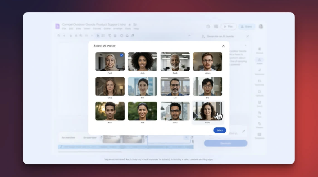 - Avatar AI đọc kịch bản: Nhập toàn bộ nội dung, Vids sẽ tạo avatar AI trình bày video không giới hạn thời lượng.