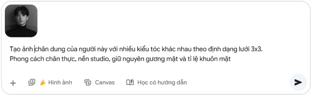 “Tạo ảnh chân dung của người này với nhiều kiểu tóc khác nhau theo định dạng lưới 3×3. Phong cách chân thực, nền studio, giữ nguyên gương mặt và tỉ lệ khuôn mặt”.