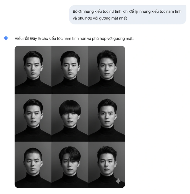 Trong trường hợp Gemini tạo ra những kiểu tóc khiến bạn không hài lòng, như tóc xoăn hoặc tóc dài (đối với con trai), bạn có thể gõ tiếp câu lệnh: “Bỏ đi những kiểu tóc nữ tính, chỉ để lại những kiểu tóc nam tính và phù hợp với gương mặt nhất”, sau đó nhấn nút Enter.