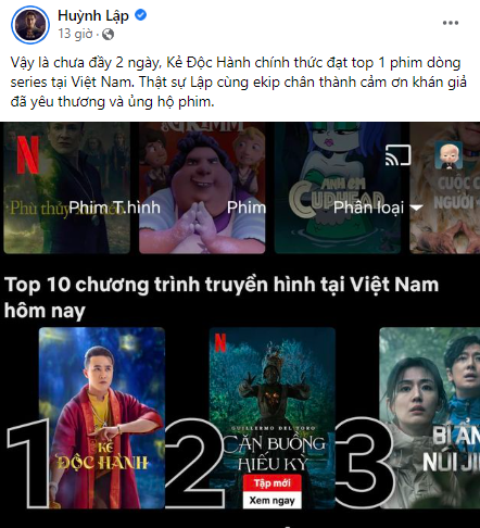 Huỳnh Lập mới đây đã vô cùng cảm xúc khi thông báo thành tích ấn tượng của Kẻ Độc Hành trên trang cá nhân: “Vậy là chưa đầy 2 ngày, Kẻ Độc Hành chính thức đạt top 1 phim dòng series tại Việt Nam. Thật sự Lập cùng ê-kíp chân thành cảm ơn khán giả đã yêu thương và ủng hộ phim”.