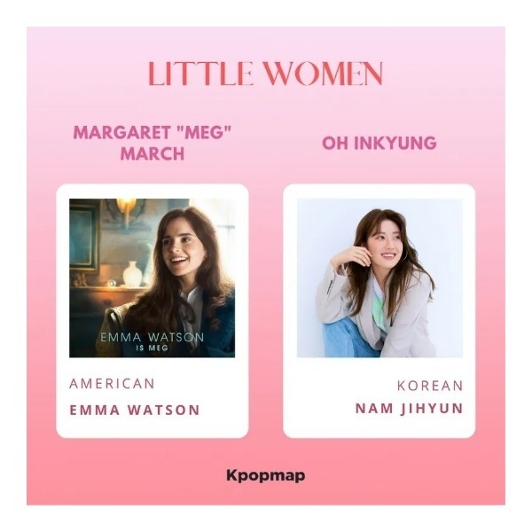 Mình nghĩ nhân vật tương ứng với On In Kyung trong tiểu thuyết là Meg March (do Emma Watson thủ vai), con gái lớn của gia đình March. Cô là người chị cả được miêu tả là giản dị, ăn nói nhẹ nhàng và suy nghĩ trưởng thành. Là người luôn dẫn dắt và quan tâm sâu sắc đến các em. Meg kết hôn vì tình yêu và không bao giờ hối hận vì những quyết định của mình.