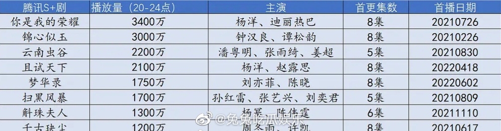 Đứng top ở bảng xếp hạng này là bộ Em Là Niềm Kiêu Hãnh Của Anh do Dương Dương và Địch Lệ Nhiệt Ba đóng chính với 34 triệu lượt xem và cũng là 8 tập ngày đầu. Xếp thứ 2 là bộ Cẩm Tâm Tựa Ngọc với 30 triệu lượt xem. Bộ Vân Nam Trùng Cốc xếp thứ 3 với 22 triệu lượt xem nhưng chỉ có 5 tập ngày đầu. Xếp trên phim của Lưu Diệc Phi và Trần Hiểu là bộ Thả Thí Thiên Hạ của Dương Dương, Triệu Lộ Tư với 21 triệu lượt xem, 8 tập.