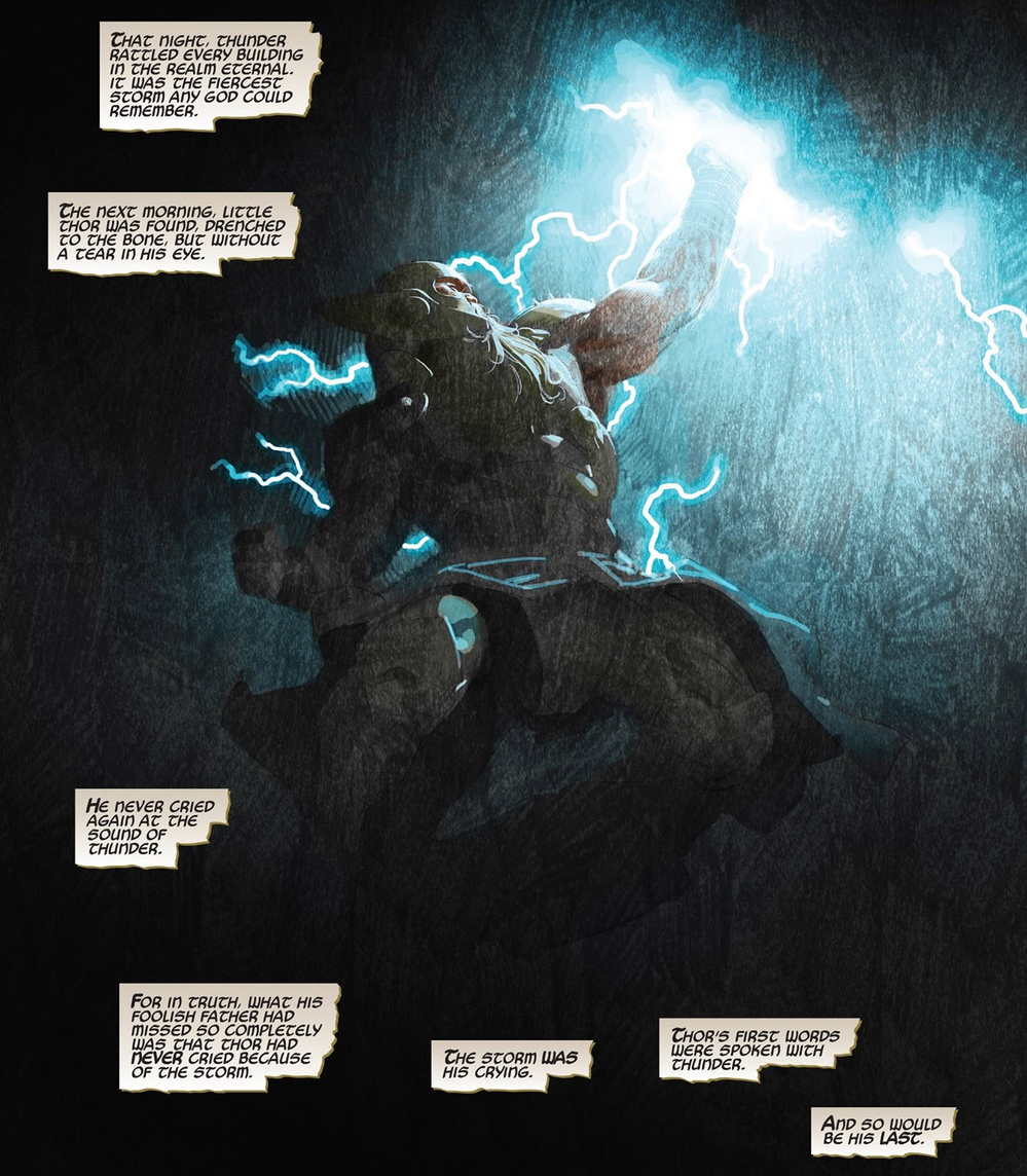 Khi Thor mới sinh ra, anh từng khóc ré lên khi nghe tiếng sấm trong bão. Vì thế mà Odin mới nghĩ là Thor sợ sấm, rồi đặt biệt danh cho Thor là God of Thunder (Thần Sấm) để chế giễu anh. Tuy nhiên, sự thật lại hoàn toàn khác. Chính tiếng khóc ré đầu đời của Thor mới là thứ đã khiến cơn bão đó được tạo ra, tức ngay từ khi còn bé thì anh đã có quyền năng thao túng thời tiết rồi.
