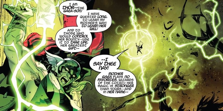 Trong truyện, Thor là con trai ruột của Odin với Gaea – một trong số ít những Cổ thần còn sống sót ở vũ trụ Marvel. Nếu bạn chưa hình dung được, thì cứ hiểu đơn giản là bà ấy hoàn toàn ngang hàng với Chthon – nguồn gốc của Chaos Magic mà Wanda sử dụng và cũng là kẻ tạo ra Darkhold ấy. Đó, chừng đó là các bạn hiểu sức mạnh của mẹ ruột Thor đẳng cấp cỡ nào rồi nhé, vượt xa đa số những vị thần Trái Đất khác luôn đó.