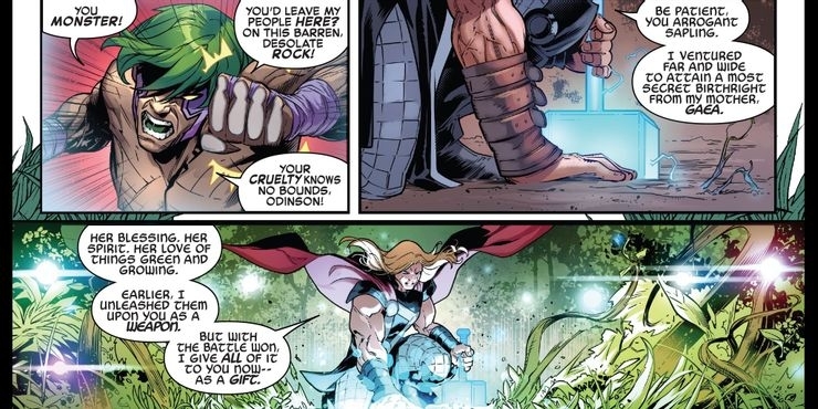 Vậy Thor có được thừa hưởng gì không? Tất nhiên là có. Nhờ có huyết thống của Cổ thần bên trong mình, tiềm năng sức mạnh của Thor lớn tới mức thậm chí có thể nói là khủng khiếp hơn bất cứ người Asgard nào từng được sinh ra. Trong tập truyện Empyre #6, Thor đã khai phá sức mạnh của mẹ mình và nhân danh bà, anh đã thu hồi sức mạnh điều khiển sự sống thực vật của những phù thủy người Cotati 1 cách dễ dàng.