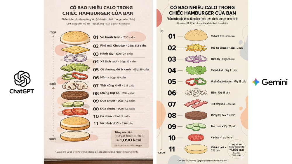 Khi xử lý văn bản tiếng Anh, cả hai mô hình đều cho kết quả tốt với font chữ rõ ràng và ít lỗi. Tuy nhiên, sự khác biệt lớn xuất hiện khi làm việc với tiếng Việt. Nano Banana Pro thể hiện khả năng xử lý dấu câu và ký tự tiếng Việt rất chính xác, văn bản hiển thị tự nhiên và dễ đọc.
