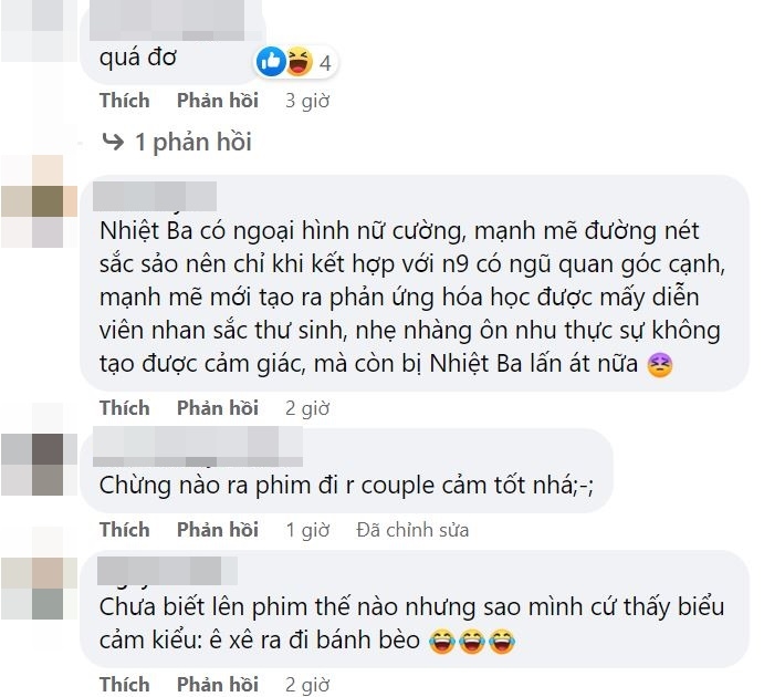 – “Nhiệt Ba đó giờ đóng chung với ai cũng không có tạo được chemistry. Ngoại lệ chắc có Hoàng Cảnh Du với Cao Vỹ Quang. Dương Dương nhiều người nói có chem chứ thực ra là do có nhiều cảnh ngọt nên thấy vậy như bình thường đứng ra có khác nào đồng nghiệp đâu”.