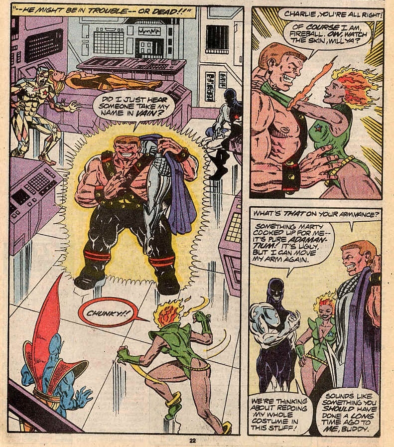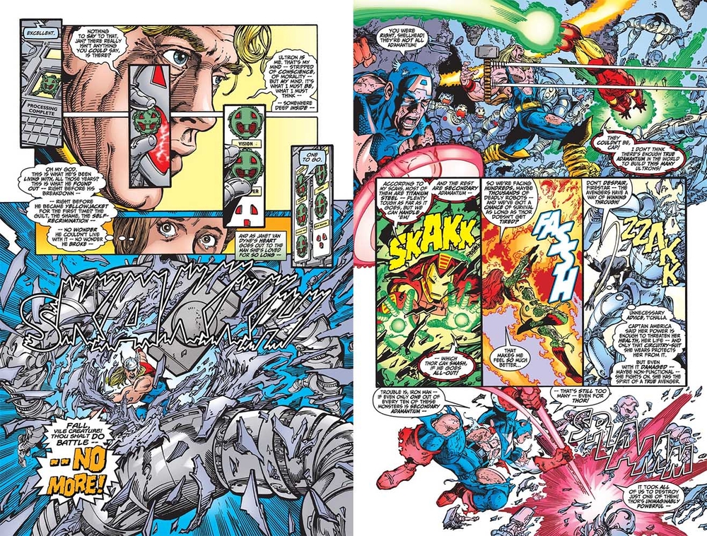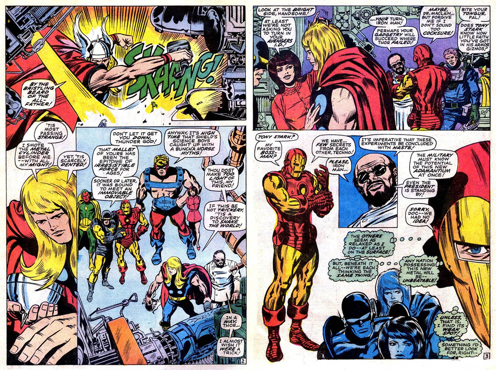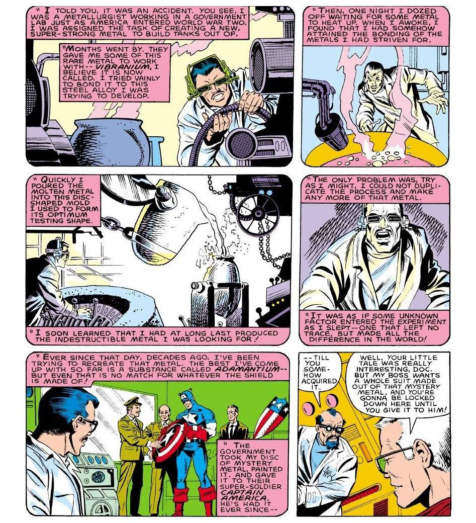 Đây chính là cảm hứng để giáo sư Myron MacLain tạo nên một hợp kim không thể phá hủy, nhằm đem lại lợi thế cho Mỹ trong Thế chiến II. Do đó, khi được Chính phủ giao cho Vibranium thì ông đã tạo nên một dạng hợp kim lạ, rồi đem nó tạo thành khiên cho Captain America. Tuy nhiên, khi đó thì Myron lại ngủ quên nên không hề biết phản ứng hợp nhất giữa các nguyên liệu diễn ra như nào, do đó không thể tạo ra thành quả tương tự.