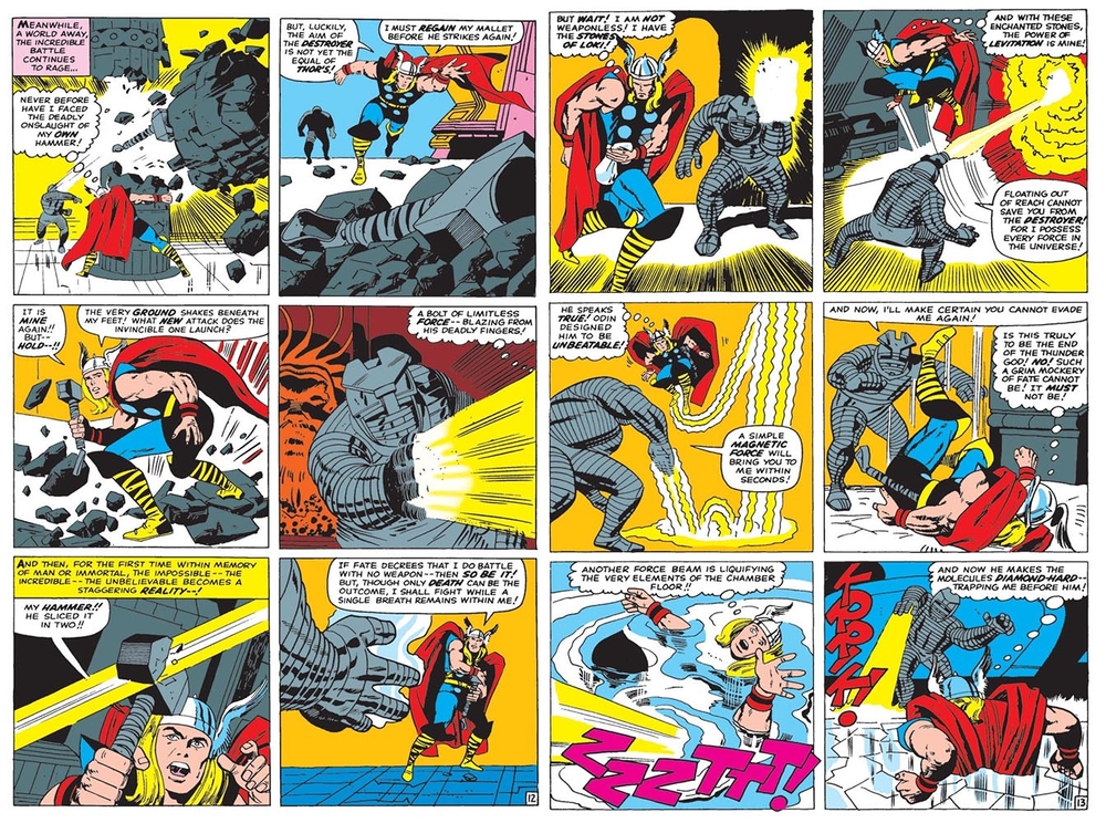 Trong truyện thì khác hẳn, bởi trong lần đối đầu đầu tiên giữa nó và Thor (Journey into Mystery #118) thì chàng Thần Sấm đã đại bại. Chỉ với một chùm tia năng lượng, nó đã xẻ chiếc búa Mjolnir ra làm đôi. Khi chiến đấu, bộ giáp mạnh tới mức đủ sức hành cả nhóm Avengers, hay đấm luôn cả Hulk lẫn Hercules. Trong tay Thor, bộ giáp đã áp đảo một Donald Blake sở hữu sức mạnh của mãng xà Jormungand và năng lượng của các Thor mà hắn đánh cắp trước đây.