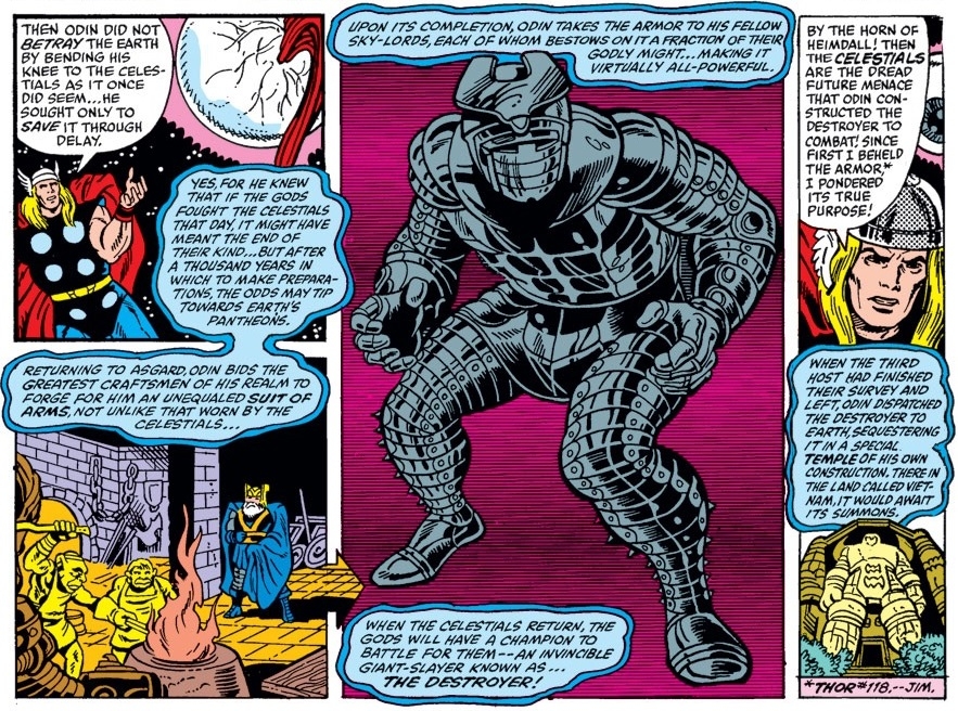 Destroyer nguyên bản là bộ giáp được tạo ra từ một thứ kim loại bí ẩn được đồn thổi là còn khủng hơn cả Uru, cường hóa thêm bằng vô số loại ma thuật của Odin và được bổ sung thêm năng lượng của các Skyfather khác. Nhờ đó, Destroyer được coi như tạo tác mạnh nhất Asgard cùng với Odinsword, với khát khao hủy diệt kinh khủng đến mức mà chỉ Odin và Galactus mới có thể kiểm soát nó.