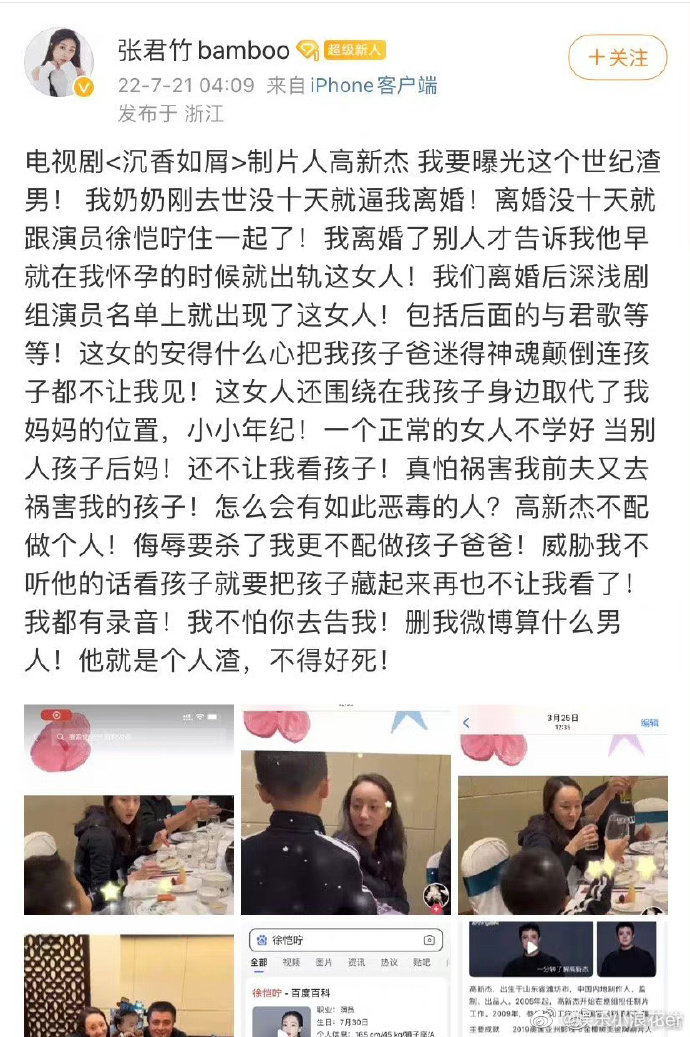 Cụ thể, một người có tên Trương Quân Trúc đã đăng bài vạch trần chồng cũ của mình là Cao Tân Kiệt, nhà sản xuất của Trầm Vụn Hương Phai “qua lại” với nữ diễn viên Từ Khải Ninh (đóng vai Huỳnh Đăng tiên tử). Người này cho biết vào lúc cô mang thai thì Cao Tân Kiệt và Từ Khải Ninh đã bắt đầu “tòm tem” với nhau. Tiếp đó, cô bị chồng buộc ly hôn, và chưa tới 10 ngày sau thì thấy anh ta cùng nữ diễn viên kia về sống chung.