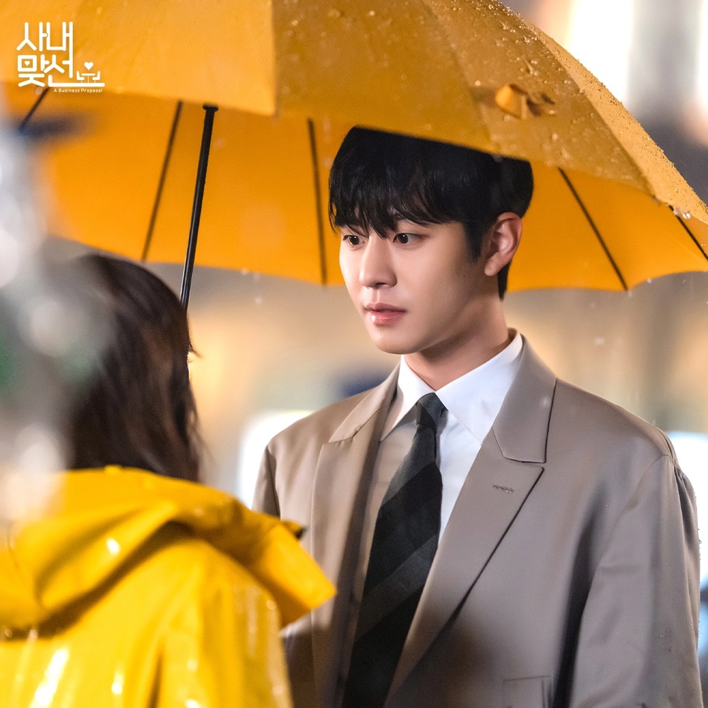 Còn chàng giám đốc “chim thủy tổ” Kang Tae Moo (Ahn Hyo Seop) và nàng nhân viên Shin Ha Ri (Kim Sejeong) của Hẹn Hò Chốn Công Sở thì cũng nhờ che chung chiếc ô màu vàng nổi bật trong cơn mưa bất chợt mà bắt đầu nảy nở tình cảm với nhau. Ánh mắt của chàng giám đốc kiêu ngạo nhìn người ta trong cảnh này thực sự là “3 phần dịu dàng, 7 phần rung rinh” đấy. Đây là cảnh quan trọng trong phim và cũng là cảnh tôi cực kỳ yêu thích luôn.