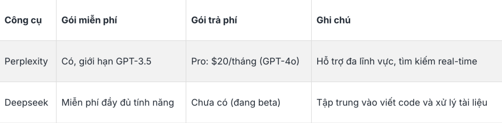 Tóm lại, Perplexity là lựa chọn lý tưởng cho những ai cần tìm kiếm thông tin nhanh chóng, chính xác và đáng tin cậy, với ưu thế nổi bật ở khả năng tổng hợp đa lĩnh vực kèm trích dẫn nguồn rõ ràng. Ngược lại, Deepseek sẽ phù hợp hơn với lập trình viên hoặc những người làm việc chuyên sâu với mã nguồn, nhờ khả năng phân tích và debug code mạnh mẽ. Dù cả hai đều sở hữu nền tảng xử lý ngôn ngữ tự nhiên ấn tượng, sự khác biệt về trọng tâm khiến Perplexity trở thành “chuyên gia tìm kiếm”, còn Deepseek là “trợ thủ lập trình” tối ưu.