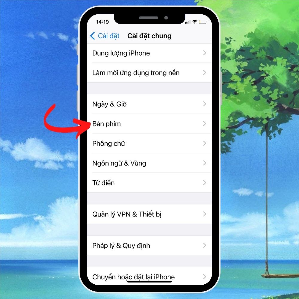 Bước 2: Tại giao diện Cài đặt chung, bạn nhấn vào mục Bàn phím và lướt xuống dưới cùng của giao diện.