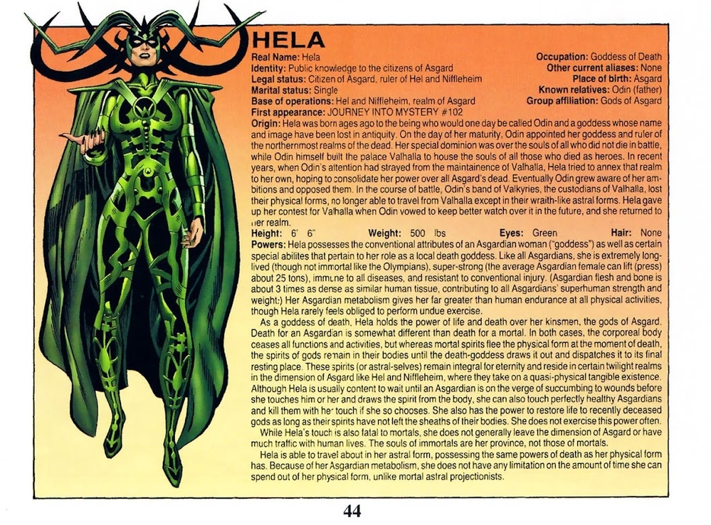 Nhắc lại về “thần thoại”, người ta thường nói Hela là con gái của Loki với Angerboda, nhưng xét về đặc điểm thì họ chỉ cùng nhau sinh ra rắn Jormungand và sói Fenris thôi. Lý do là vì Angerboda có gen “sói” từ cha là Vârcolac (Thần quỷ sói, tạo vật của Cổ thần Chthon) và gen “rắn” từ mẹ là Echidna (hậu duệ của Phorcys, tạo vật của Cổ thần Set). Nói tóm lại, nguồn gốc của Hela khá mập mờ và chỉ có câu chuyện về Leah thì mới là “tín” thôi.