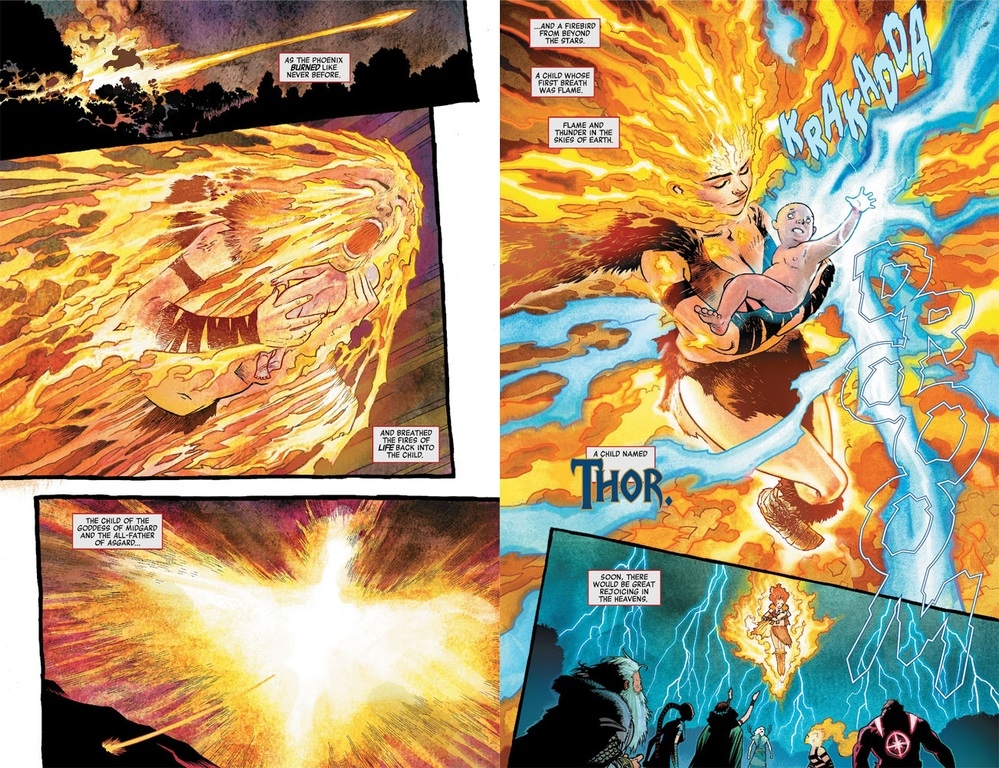 May thay, Firehair đã kịp thời can thiệp, đánh bại bè lũ Laufey rồi dùng ngọn lửa phượng hoàng để khôi phục sự sống cho bé Thor. Nhìn chung, Firehair yêu thương Thor dù là con trai của tình cũ, Phoenix Force do ảnh hưởng của vật chủ cũ nên nhận bản thân là mẹ Thor, còn Gaea thì cũng coi Firehair như người mẹ thứ 2 của con mình. Nhưng vì muốn giữ bí mật, Gaea đã không cho Odin nói sự thật cho Thor biết và giao anh cho Frigga nuôi dưỡng.