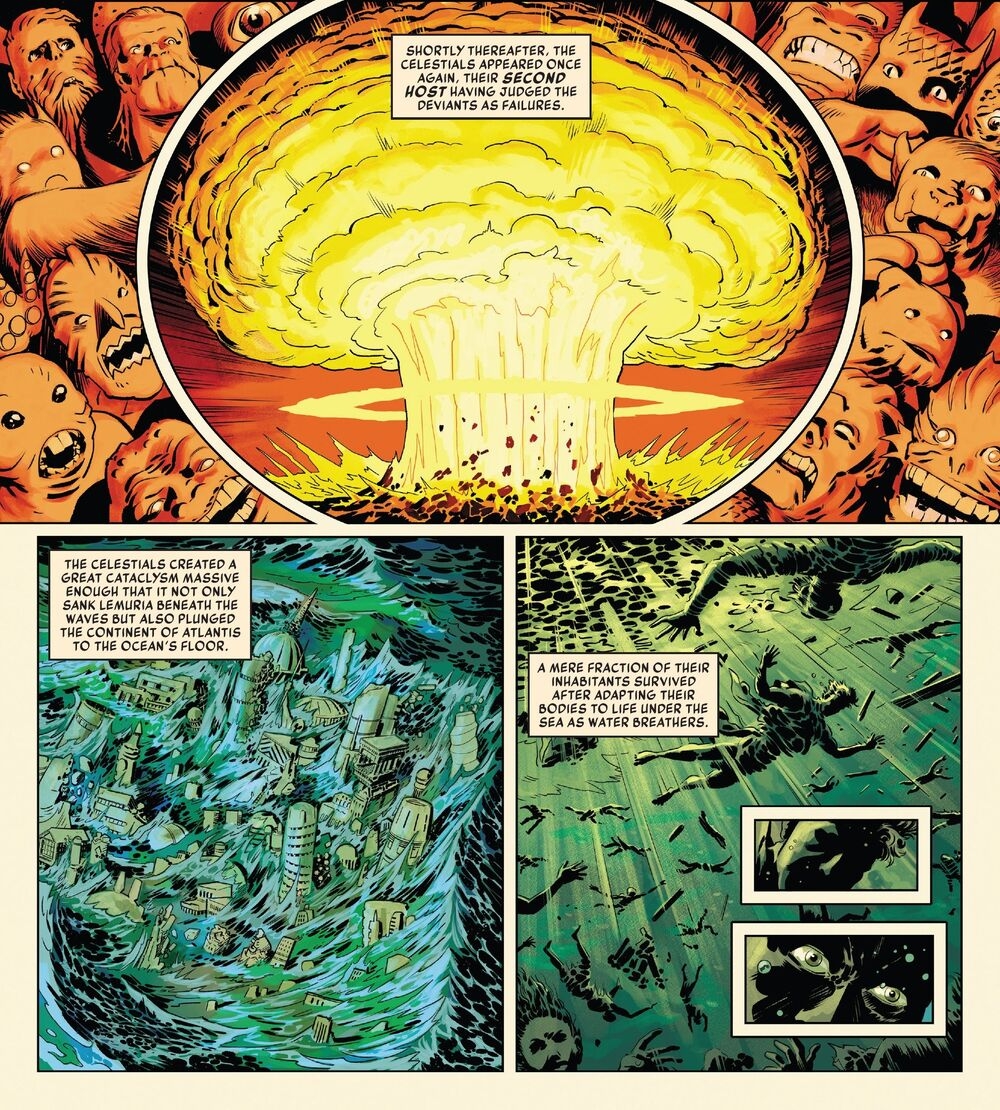 Do đó, vua Kamuu đã mở các hố magma, dùng dung nham nóng chảy tiêu diệt quân Deviant. Nhưng do áp suất núi lửa quá khủng khiếp, núi lửa phun trào cùng động đất đã khiến toàn bộ lục địa Atlantis bị tàn phá. Trong lúc đó, quân Deviant còn phát động tấn công vào những Celestial. Kết quả là Arishem đưa ra phán quyết, đánh chìm toàn bộ lục địa Lemuria xuống đáy biển.