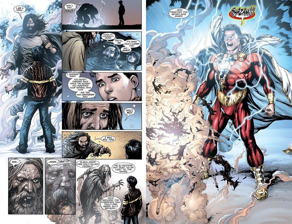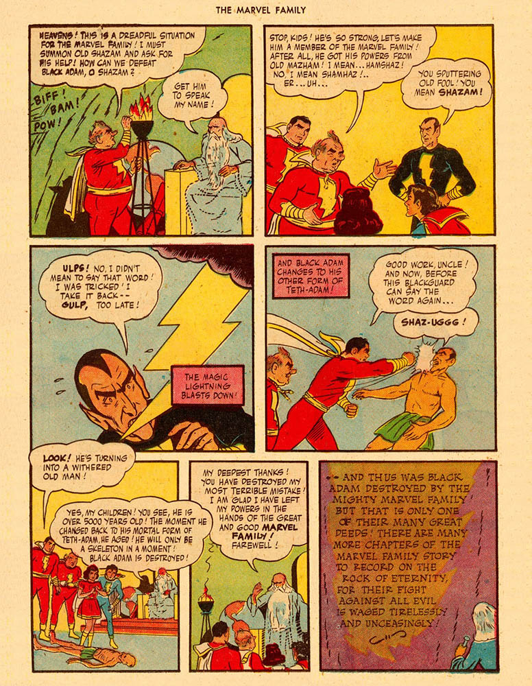 Tia sét đánh xuống, Adam trở lại nhân dạng phàm trần. Chỉ chờ có thế, Billy tung 1 đấm và Adam bất tỉnh. Tuy nhiên, khi này thì họ mới nhận ra cơ thể của ông ta đã teo tóp lại chỉ còn da với xương do tác động của thời gian. Sau hàng chục năm, Black Adam mới có thể trở lại nhờ cỗ máy phục sinh của tiến sĩ Thaddeus Sivana.