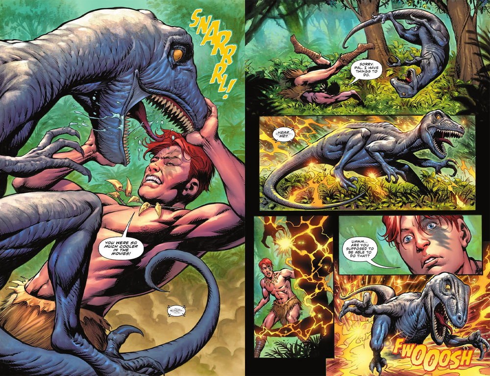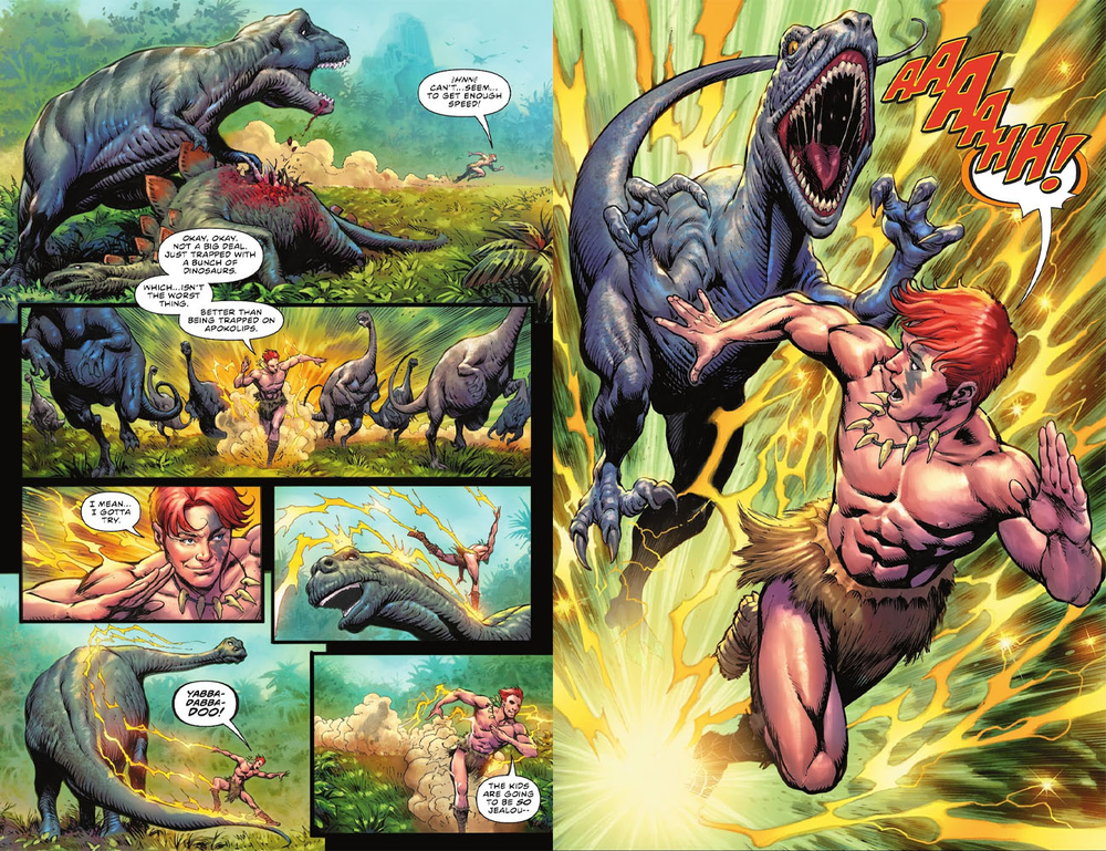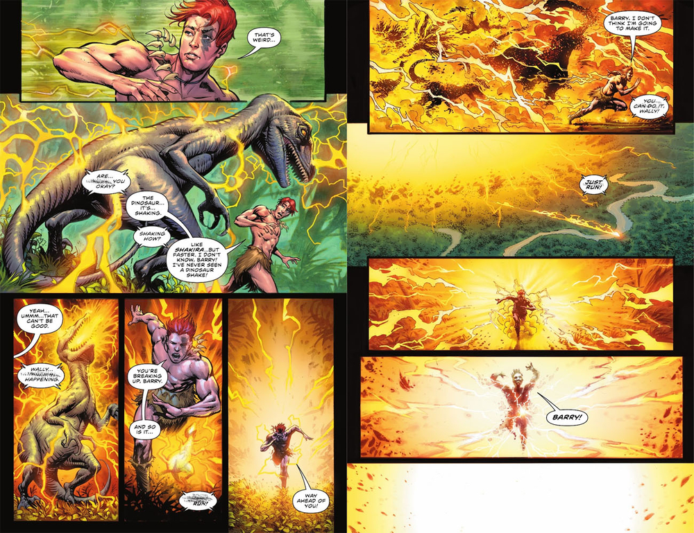 Với tốc độ sẵn có cùng sự cường hóa của Speed Force, con khủng long rượt Wally chạy té khói. Anh đã chạy băng qua cánh rừng, vượt qua một ngọn núi lửa, nhưng con khủng long háu đói vẫn không chịu buông tha anh. Tuy nhiên, ngay lúc này thì con Velociraptor bỗng khựng lại do không thể kiểm soát được Speed Force, rung tại chỗ liên tục rồi phát nổ, tạo ra một luồng xung điện khổng lồ hủy diệt toàn bộ mọi thứ xung quanh.