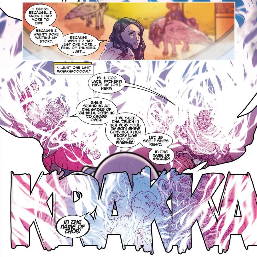 Một minh chứng nữa là tình trạng của Mjolnir. Trong truyện, Jane cũng dùng 1 cây búa chắp vá là Mjolnir của Thor bên Earth-1610, nhưng nó cũng chỉ dùng được 1 lần trước khi tan vỡ lần nữa. Do đó, mình nghĩ Mjolnir hiện tại cũng chỉ tạm thời được “gắn” bằng ma thuật, và lý thuyết thì phương thức này chỉ là tạm bợ mà thôi. Mjolnir sẽ sớm trở lại tình trạng cũ, và Jane cũng sẽ không thể làm Thor nữa.