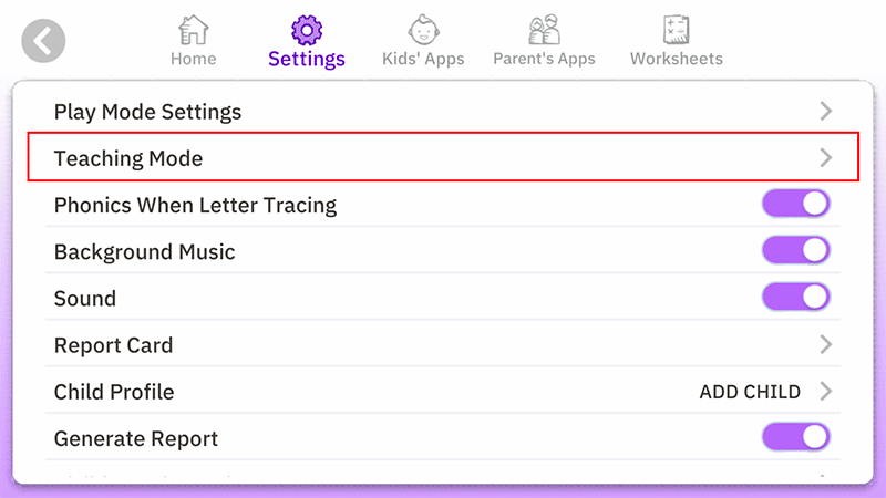 Ở chế độ dạy học, phụ huynh có thể giới hạn lại những chữ cái mà con sẽ được học. Điều này giúp trẻ, và cả bạn, theo sát được quá trình học. Ví dụ như bạn chỉ mở khoá 4 chữ cái để con học trong hôm nay. Khi nào đã thuộc, bạn mới mở thêm các chữ cái tiếp theo. Trong Settings > mục Teaching Mode sẽ có hộp thoại để bạn lựa chọn.