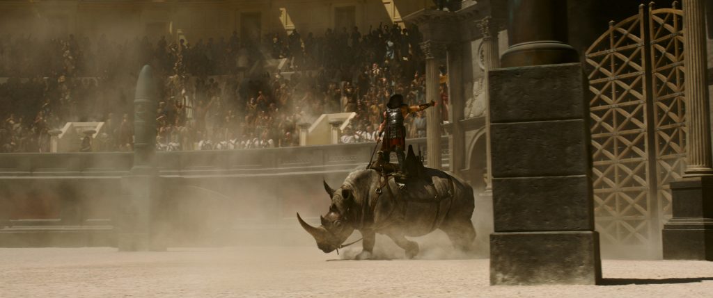 Đạo diễn Scott còn tăng kịch tính cho bộ phim khi dựng trận chiến “trên biển” giữa đấu trường, với cảnh xung đột của các tàu chiến vô cùng mãn nhãn. Không quên hình ảnh con tê giác dũng mãnh được đưa vào trường đấu thay cho hổ ở phần đầu cũng gây ấn tượng thị giác và sự khốc liệt của sinh tồn.