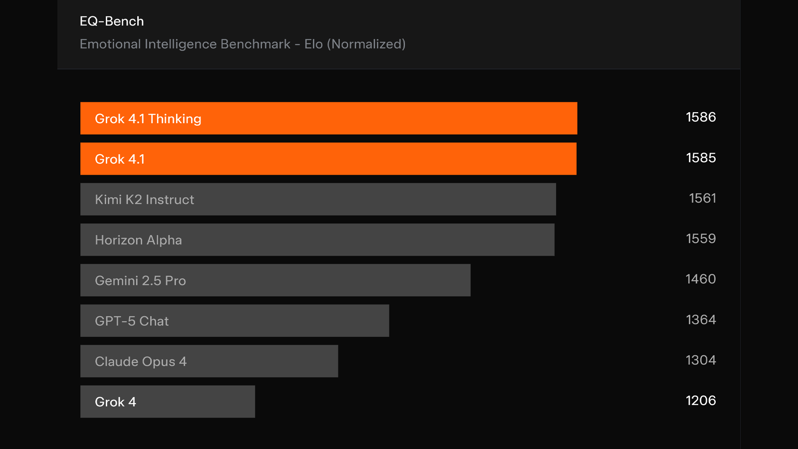 Điểm đáng chú ý là chế độ Fast của Grok 4.1 còn vượt qua cả chế độ lý luận đầy đủ của nhiều mô hình đối thủ, cho thấy sự cải thiện lớn so với Grok 4 – vốn chỉ đứng hạng 33 trước đó.
